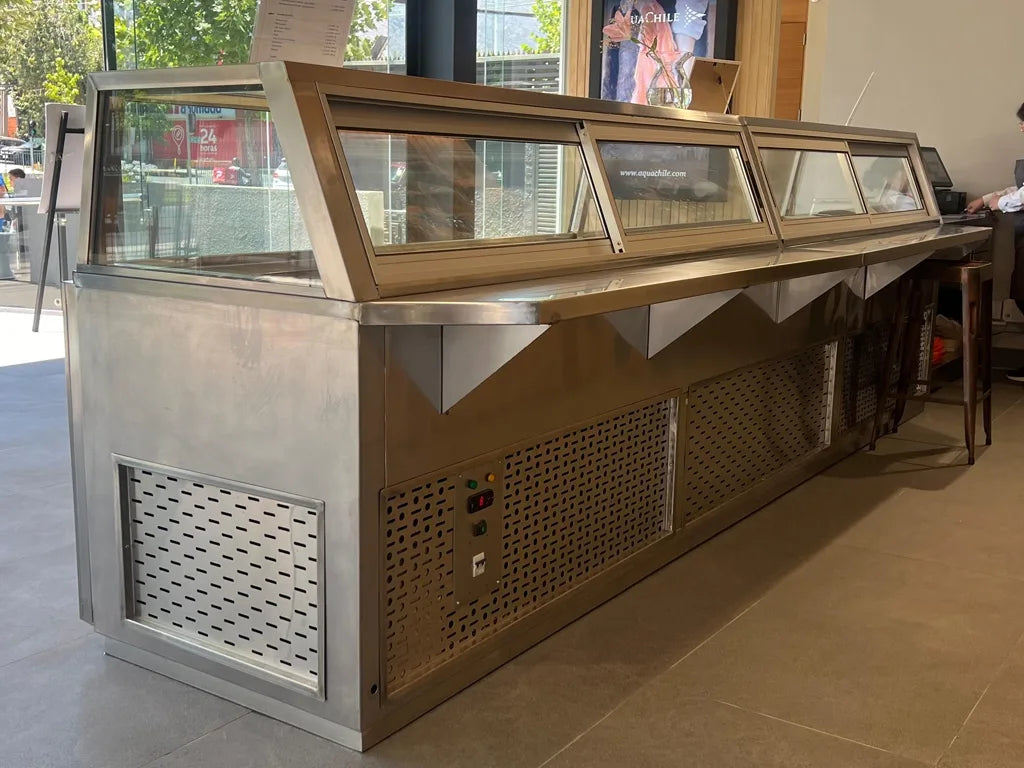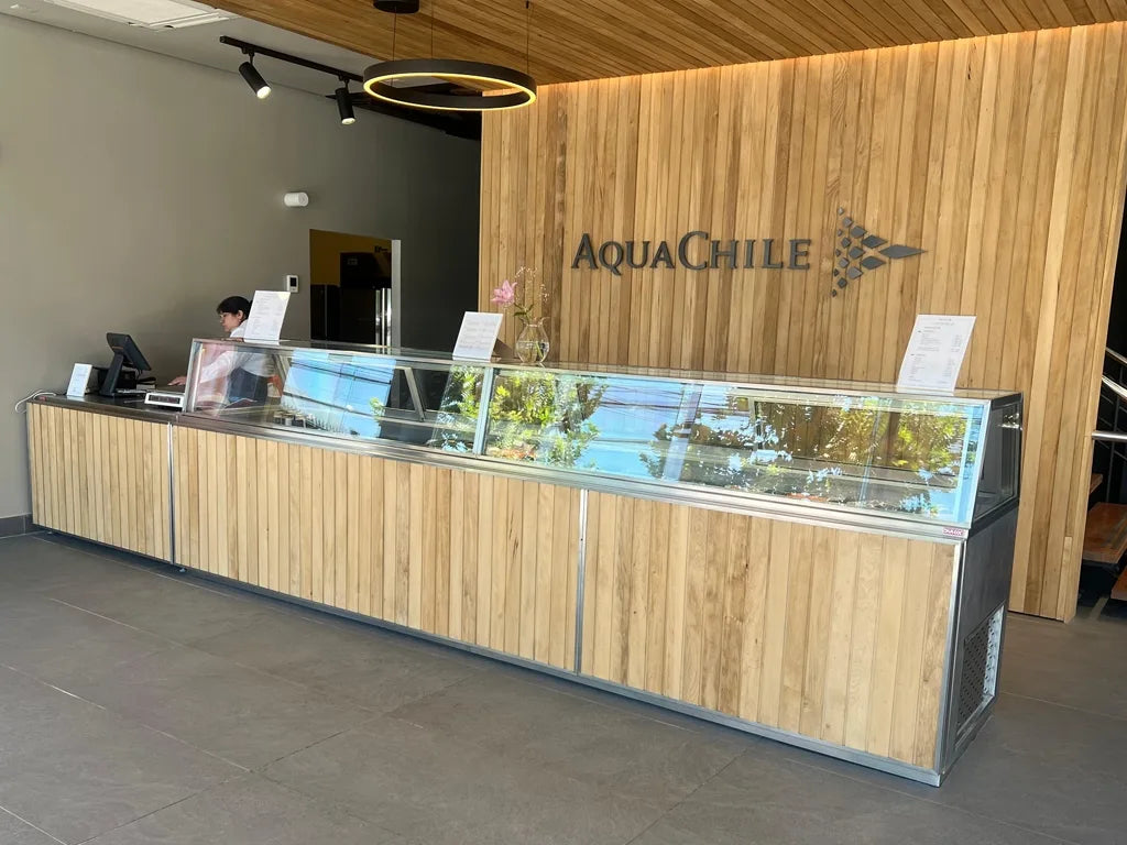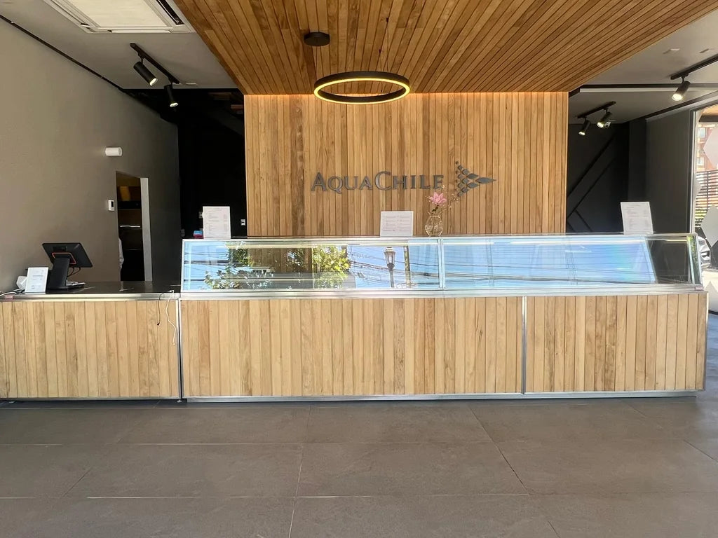 DULOX diseñó y fabricó a medida una vitrina refrigerada de 4.5 metros para la nueva sucursal de Aqua Chile en Av. La Dehesa. Este proyecto presentó un desafío técnico debido a la gran extensión de la vitrina y la necesidad de mantener una temperatura constante de -18°C.