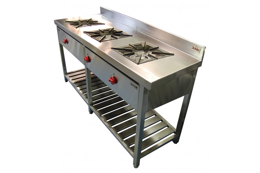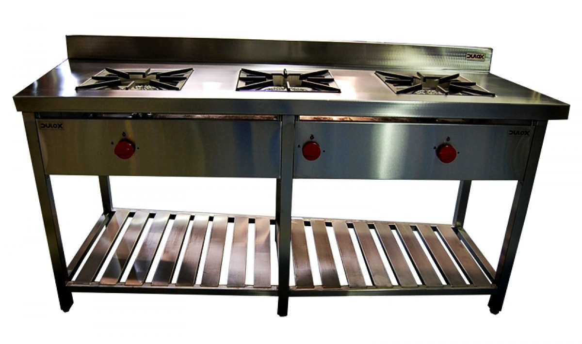COCINA INDUSTRIAL DE 1800MM LARGO X 860MM DE ALTURA, CON ANCHO DE 700MM AL COSTADO IZQUIERDO Y 550MM AL DERECHO. CAPACIDAD 3 PLATOS CON PARRILLA DE 350X350MM. ESTRUCTURA SOPORTANTE EN PERFIL 30X30MM CON REPISA INFERIOR. FABRICADA ÍNTEGRAMENTE EN ACERO INOXIDABLE CALIDAD AISI 304-L EN 1MM ESPESOR. SISTEMA DE FUNCIONAMIENTO A GAS.