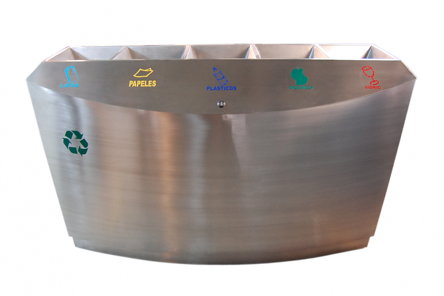 BASURERO ESPECIAL PARA RECICLAJE DE 1500 MM DE LARGO X 600 MM DE ANCHO X 950MM DE ALTURA, FABRICADO INTEGRAMENTE EN ACERO INOXIDABLE CALIDAD AISI 304-L EN 1,5MM DE ESPESOR, CON GABINETES INTERIORES INDEPENDIENTES, CAPACIDAD 5 COMPARTIMIENTOS, SISTEMA CÓNICO SUPERIOR PARA BASUR Y GABINETES INTERIORES EN ACERO 430 PARA BOLSA DE BASURA. NO INCLUYE GRÁFICA. PESO 70KG.