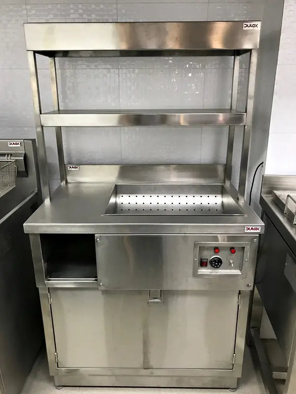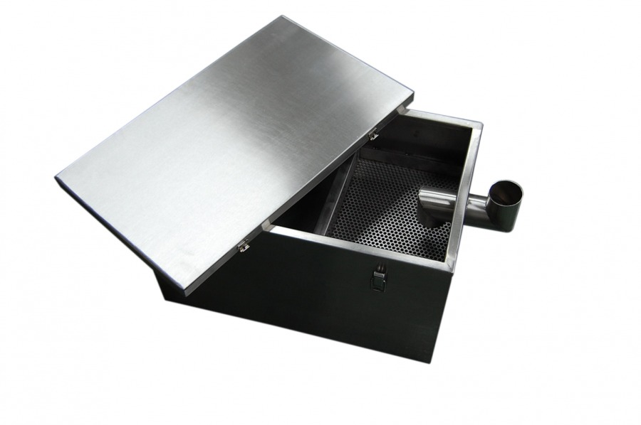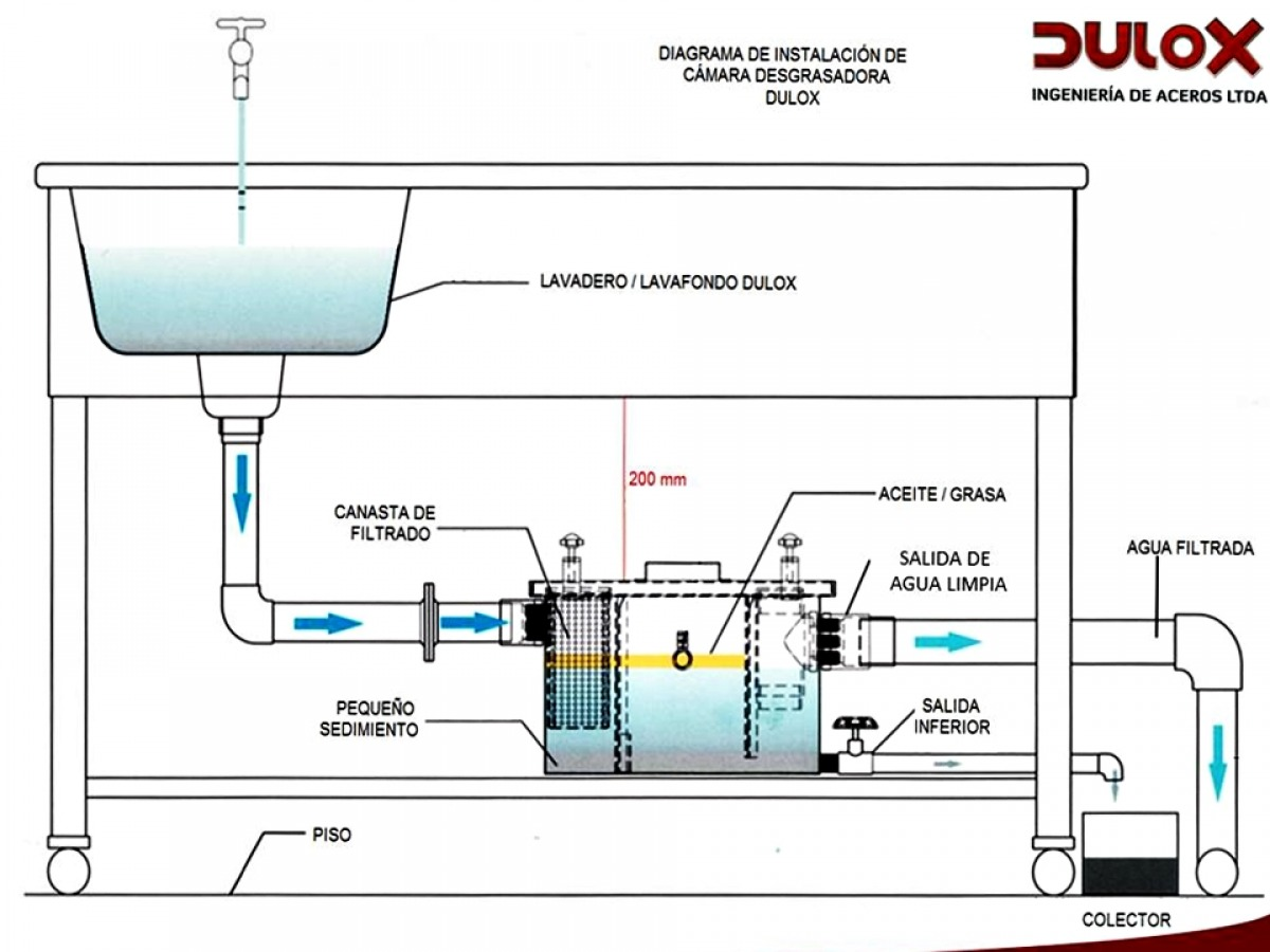 Cámara desgrasadora capacidad para 20 ltrs, de 415 mm de largo x 240 mm de ancho x 250 mm de altura, fabricada íntegramente en acero inoxidable calidad AISI 304-L en 1 mm de espesor, con canastillo interior y lámina central para filtro. Salida de 2" de diámetro.