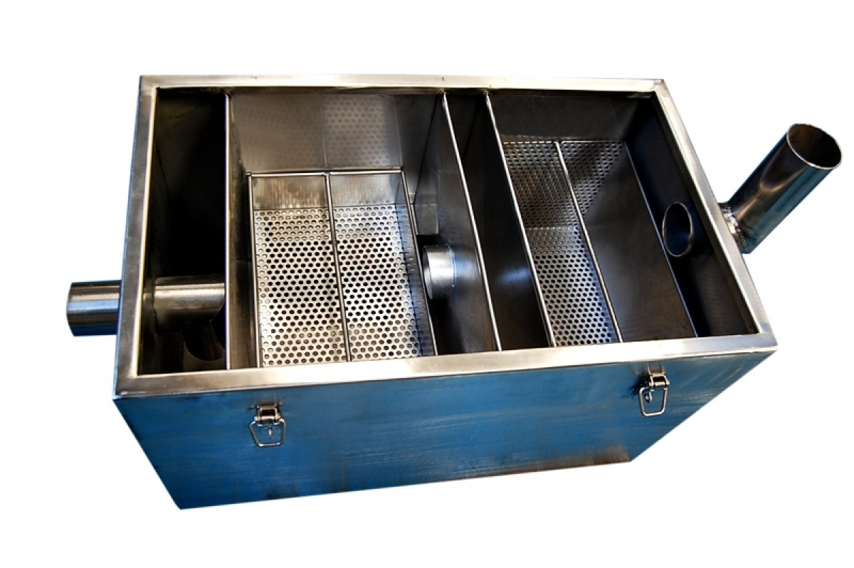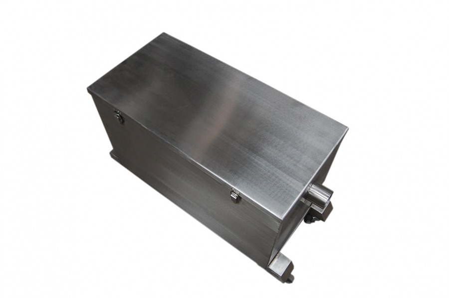Cámara desgrasadora capacidad para 40 ltrs, de 500 mm de largo x 300 mm de ancho x 300 mm de altura, fabricada íntegramente en acero inoxidable calidad AISI 304-L en 1 mm de espesor, con canastillo interior, lámina central para filtro. Entrada y salida para 2 pulgadas de diámetro.