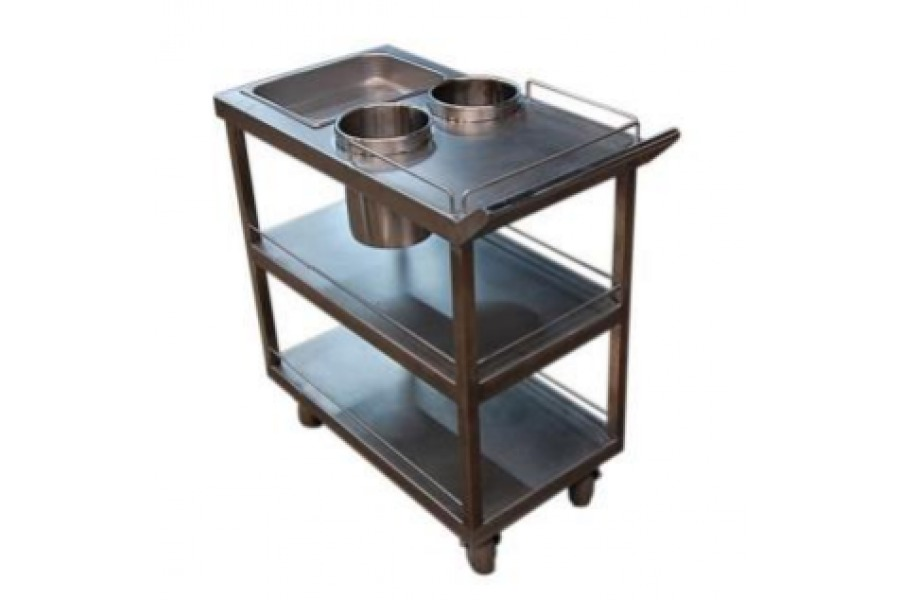CARRO PARA SUSHI DE 900MM LARGO X 500MM ANCHO X 850MM ALTURA. FABRICADO ÍNTEGRAMENTE EN ACERO INOXIDABLE CALIDAD AISI 304-L 1MM ESPESOR. ESTRUCTURA EN PERFIL 30 X 30 MM. INCLUYE 3 BANDEJAS LISAS CON BARRA ANTI RÓLIDO. DEPOSITO DE ½ X 60 MM Y DOS RECIPINETES EN CUBIERTA. INCLUYE RUEDAS (2 CON FRENO) Y MANILLA PARA ARRASTRE.