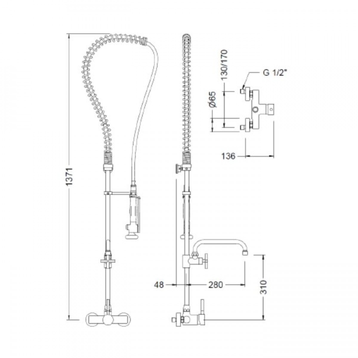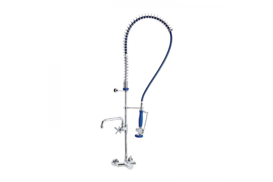 Columna de cocina profesional con grifo mezclador monomando y grifo con caño giratorio para instalar en pared sobre la encimera. Dotada de un muelle de acero inoxidable AISI 304 cromado. Grifo en latón CC754S, soportes y barra en latón CW617N cromados según EN 248. Provisto de un flexo de acero inoxidable con funda plástica para facilitar la limpieza. Ducha con diseño ergonómico, cierre automático y doble posición de espray (concentrado y ducha). Grifo con caño dotado de montura cerámica ¼ vuelta. Grifo mezclador dotado de cartucho cerámico mezclador D40 y válvulas antirretorno. Incluye todos los elementos de fijación.