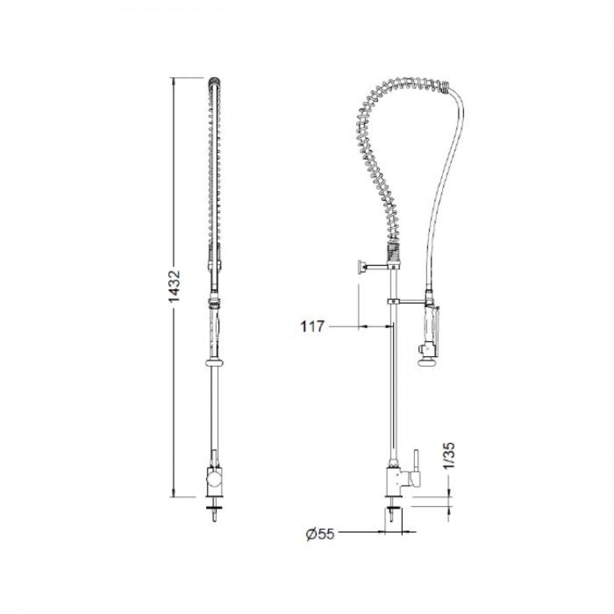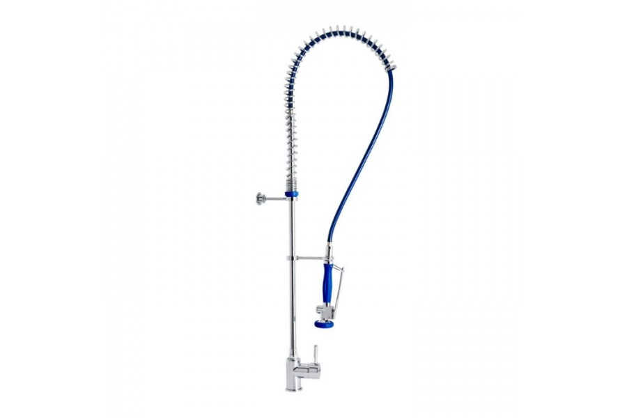 Columna de cocina profesional con grifo mezclador monomando para instalar sobre encimera. Dotada de un muelle de acero inoxidable AISI 304 cromado. Grifo en latón CC754S, soportes y barra en latón CW617N cromados según EN 248. Provisto de un flexo de acero inoxidable con funda plástica para facilitar la limpieza. Ducha con diseño ergonómico, cierre automático y doble posición de espray (concentrado y ducha). Grifo con cartucho cerámico mezclador D40, conexiones flexibles y válvulas antirretorno. Incluye todos los elementos de fijación.