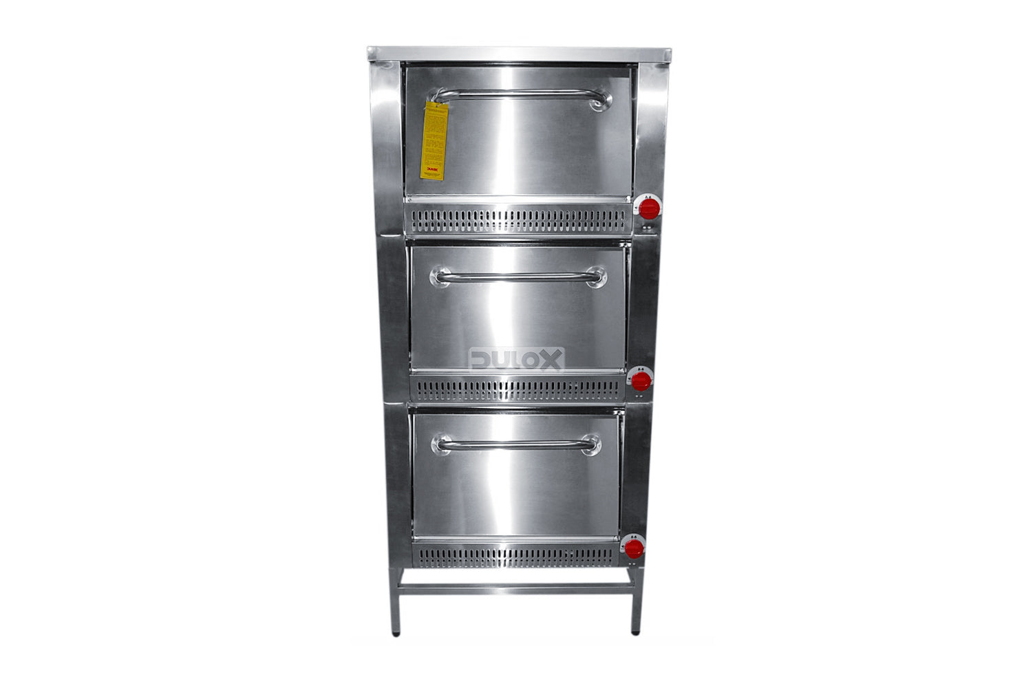 HORNO TRES CAMARAS 970 X 860 X 1777MM DE ALTO, FABRICADO INTEGRAMENTE EN ACERO INOXIDABLE CALIDAD AISI 304-L, CON 3 BANDEJAS ENLOZADAS DE 650 X 650 MM CON ATRIL. POTENCIA 37,5 KW. FUNCIONAMIENTO A GAS (LICUADO O NATURAL). TEMPERATURA DE 0º A 300ºC. PESO APROX. 286 KGS.