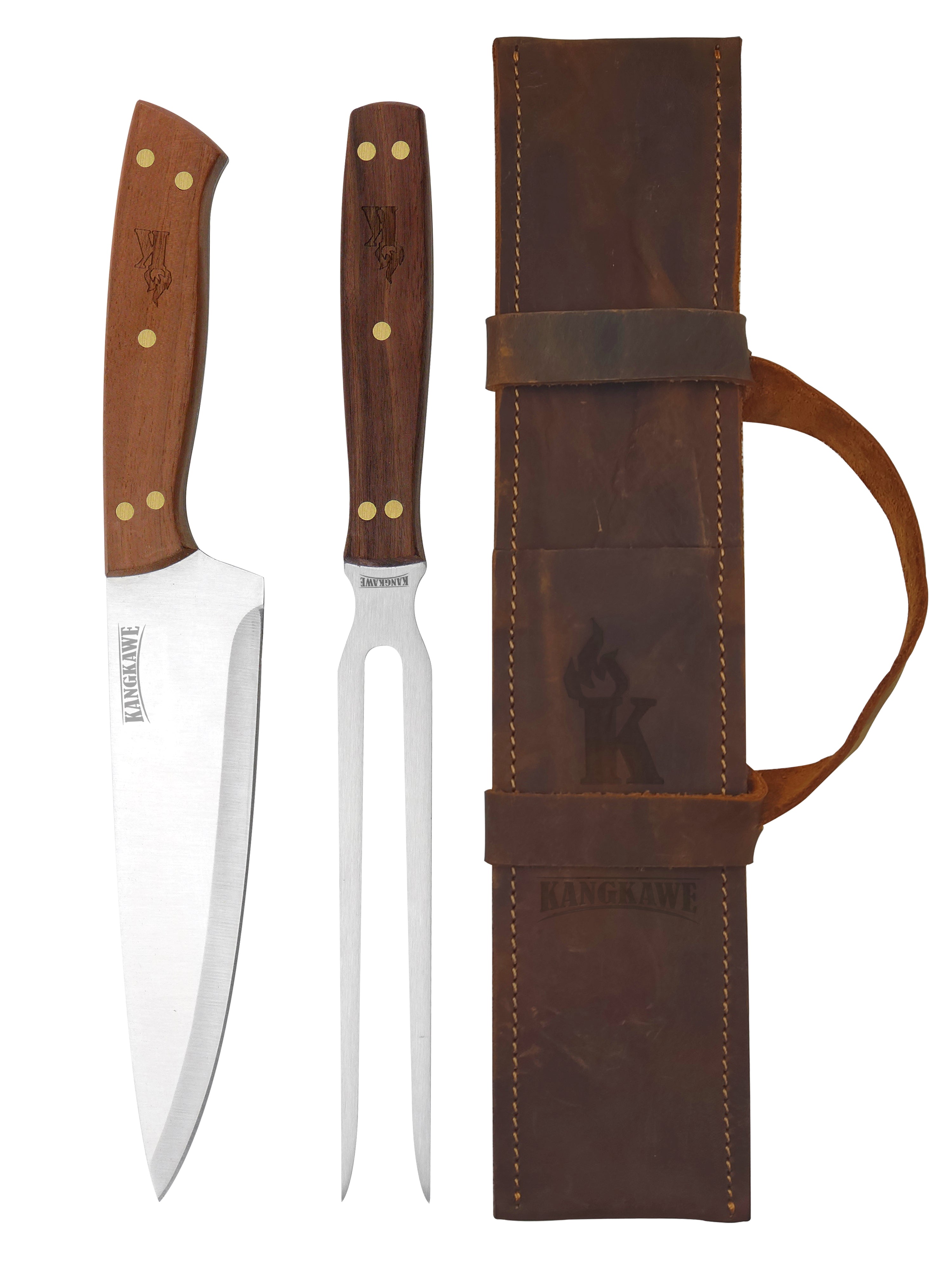 Set tenedor + cuchillo parrillero f/cuero café rustico. cuchillo de 7" de 315 mm de largo x 32 mm de ancho x 18 mm de alto y tenedor largo de 310 mm de largo x 27 mm de ancho x 18mm de alto. manipular con cuidado.