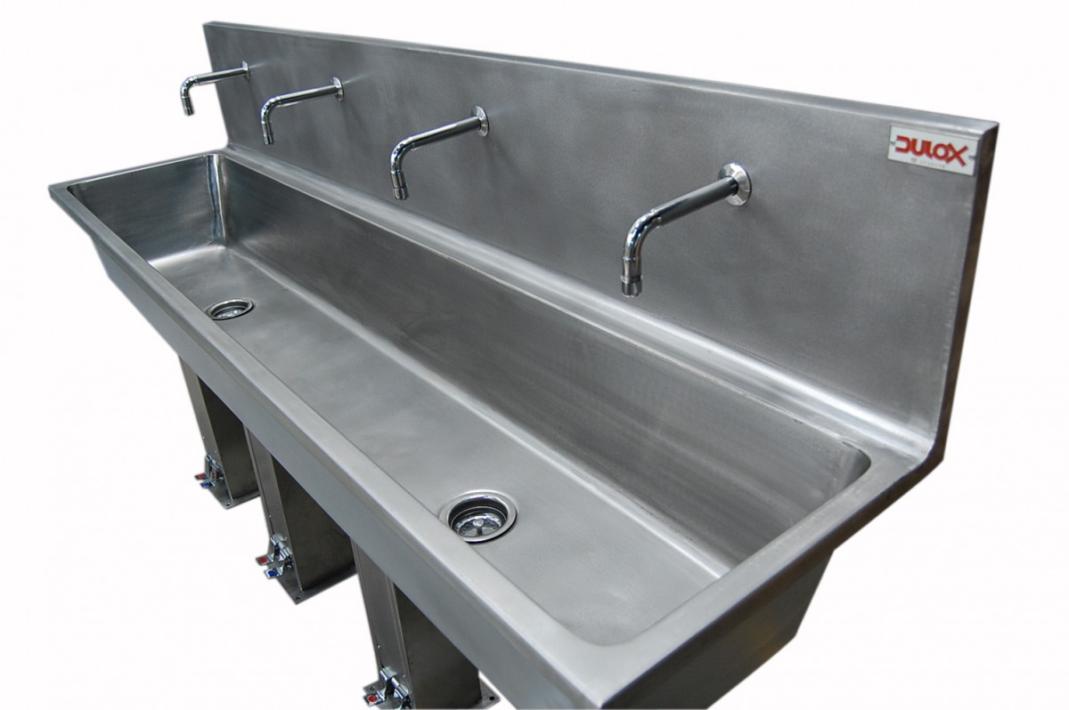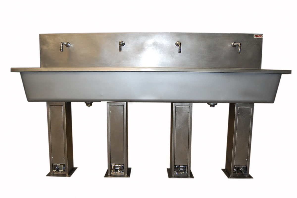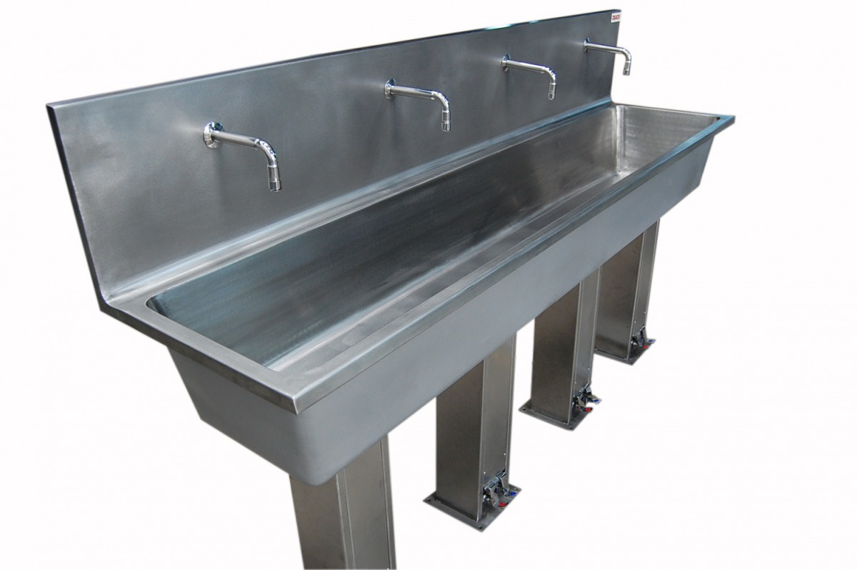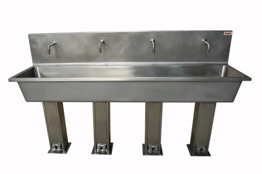 LAVADERO DE CUATRO PUESTOS DE 2000 X 500 X 1190MM. CON TAZA DE 1900 X 400 X 250 MM DE PROFUNDIDAD, PEDESTALES CON FLANCHES DE FIJACIÓN A PISO. 2 DESAGÜES DE 4 1/2" DIÁMETRO. FABRICADO ÍNTEGAMENTE EN ACERO INOXIDABLE CALIDAD AISI-304 EN 1,5MM ESPESOR. CON LLAVE SISTEMA PEDAL. INCLUYE CUELLO CISNE AL MURO Y DESAGÜES