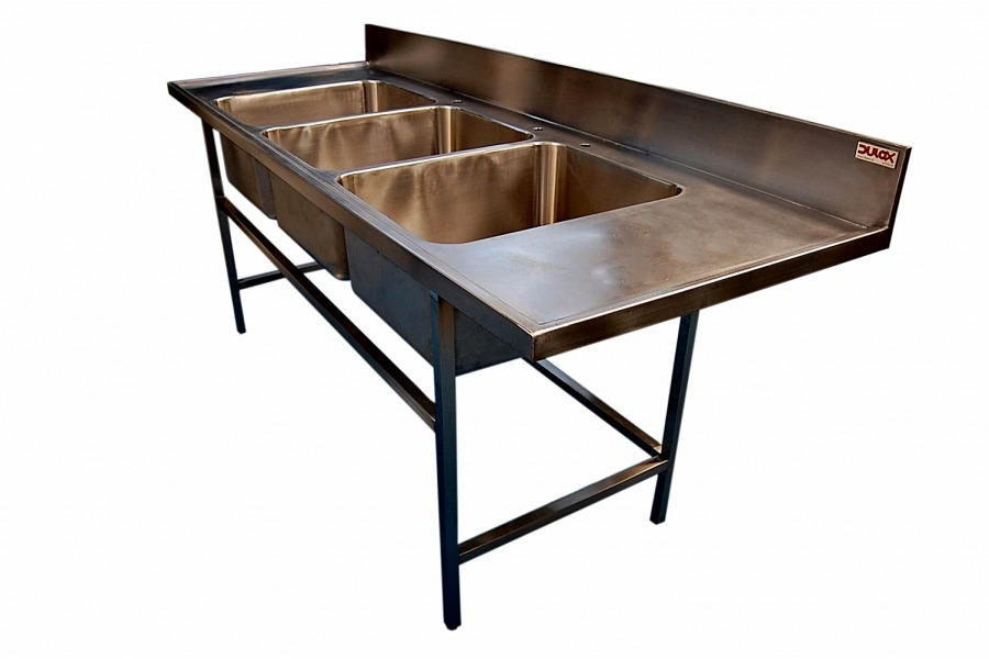 LAVADERO DE 2200 MM DE LARGO X 800 MM DE ANCHO X 900MM DE ALTURA CON 3 TAZAS Y DOS SECADORES LISOS. SOPORTE Y AMARRAS EN PERFIL 30X30MM, CON 3 TAZAS DE 500 X 600 X 300 MM PROFUNDIDAD Y PERFORACIÓN PARA DESAGÜE DE 4 1/2. FABRICADO INTEGRAMENTE EN ACERO INOXIDABLE CALIDAD AISI 304-L EN 1,5MM ESPESOR. NO INCLUYE GRIFERÍA.