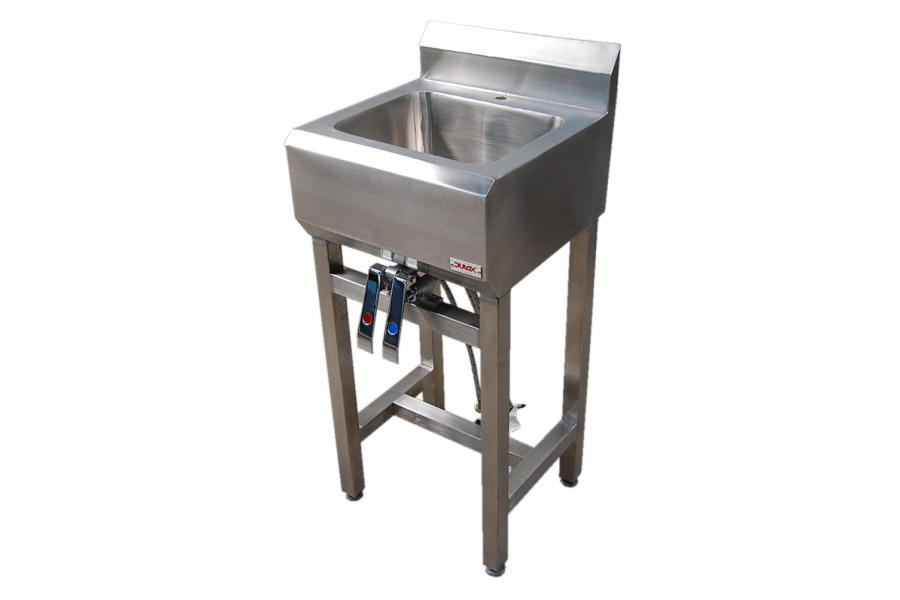LAVAMANOS CON ACCIONAMIENTO DE RODILLA ESPECIAL PARA MURO DE 420 X 410 X 860 MM ALTURA. CON TAZA INTERIOR DE 300 X 250 X 180 MM. ESTRUCTURA EN PERFIL 30 X 30 MM. FABRICADO ÍNTEGRAMENTE EN ACERO INOXIDABLE CALIDAD AISI 304-L EN 1,5 MM DE ESPESOR. INCLUYE DESAGÜE Y CUELLO CISNE.