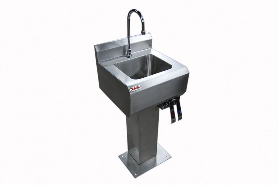 LAVAMANOS PARA MURO DE 420 X410 X 860 MM ALTURA CON TAZA INTERIOR DE 300 X 250 X 180 MM CON PEDESTAL CUBRE CAÑERIA FABRICADO INTEGRAMENTE EN ACERO INOXIDABLE CALIDAD AISI 304-L 1,5 MM ESPESOR ACCIONAMIENTO POR RODILLA, PESO APROX. 19 KILOS INCLUYE DESAGUE Y CUELLO CISNE.