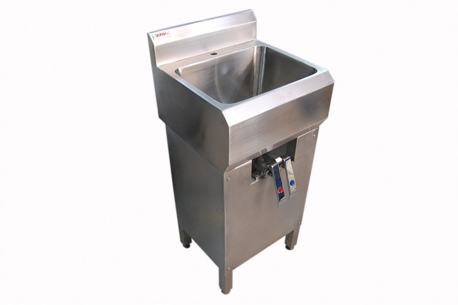 LAVAMANOS CON ACCIONAMIENTO DE RODILLA ESPECIAL PARA MURO DE 420 X 410 X 860 MM ALTURA. CON TAZA INTERIOR DE 300 X 250 X 180 MM CON FALDÓN CUBRE CAÑERÍA, CERRADO. FABRICADO ÍNTEGRAMENTE EN ACERO INOXIDABLE CALIDAD AISI 304-L EN 1,5 MM DE ESPESOR. INCLUYE DESAGÜE Y CUELLO CISNE.