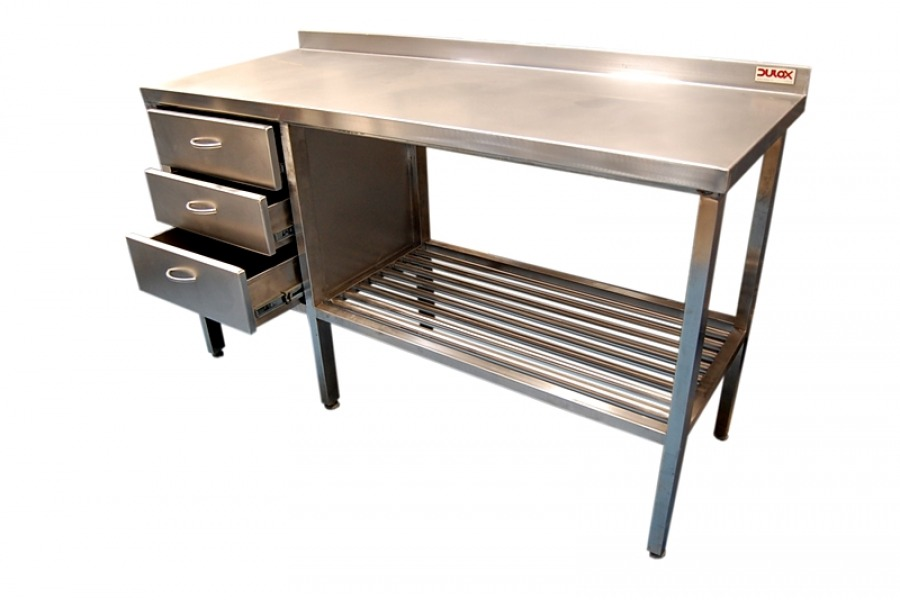 MESON DE TRABAJO 1300 X 600 X 850MM ALTURA. FABRICADO ÍNTEGRAMENTE EN ACERO INOXIDABLE CALIDAD AISI 304-L EN 2 MM DE ESPESOR. ESTRUCTURA FABRICADA EN PERFIL RECTANGULAR 50 X 30. TRES CAJONES Y RESPALDO DE 60 MM. REPISA INFERIOR EN PERFIL TUBULAR DE 1" Y PATINES REGULABLES.
