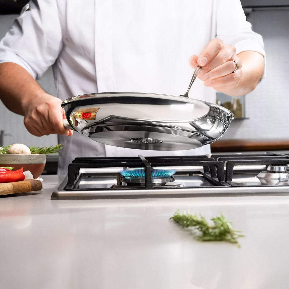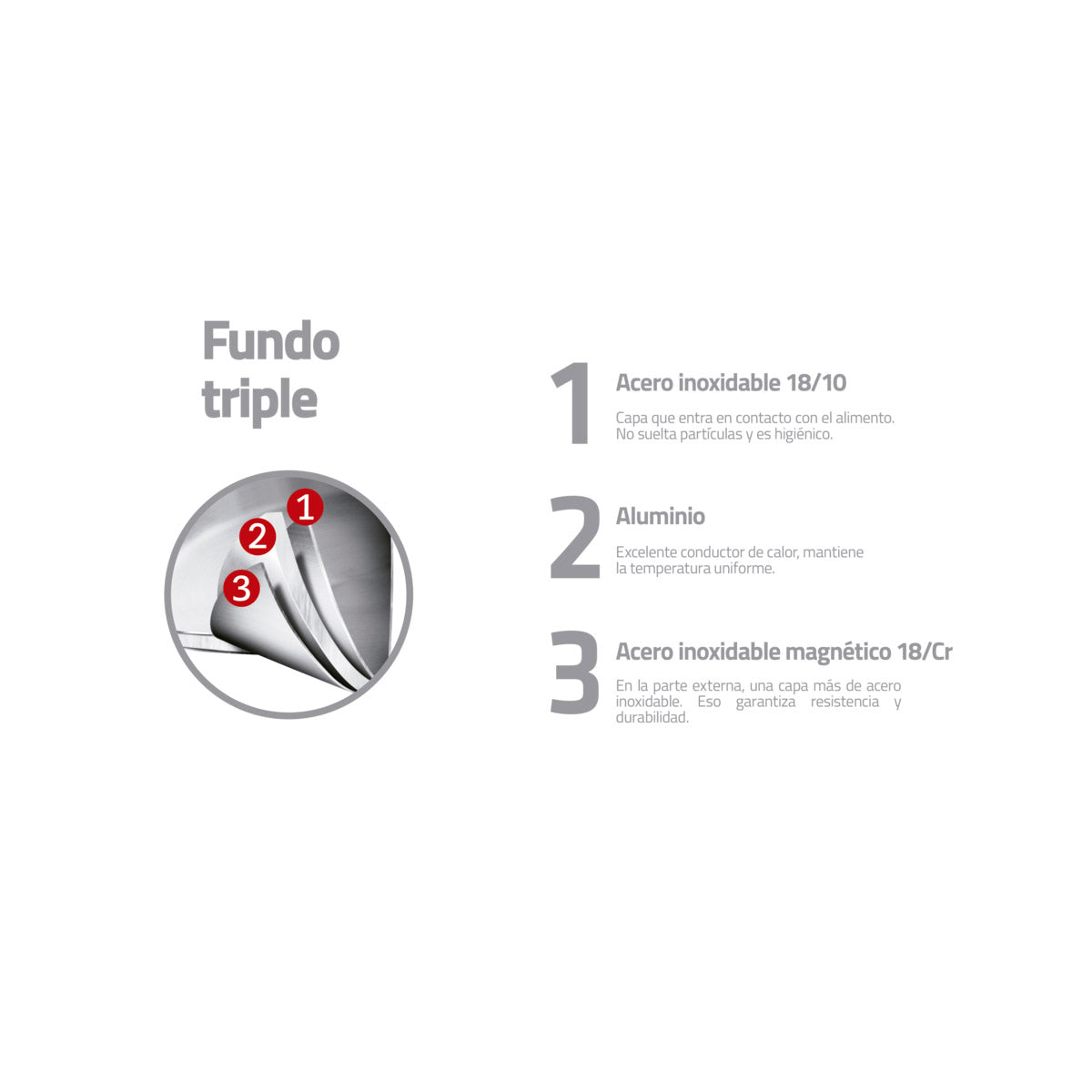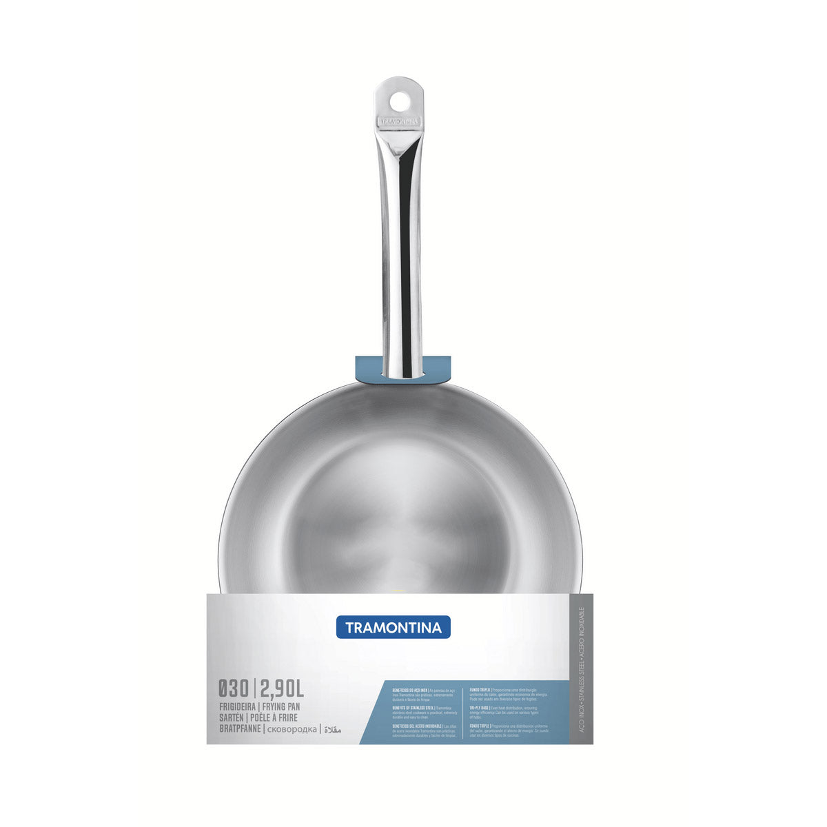 El sartén Tramontina de acero inoxidable con cuerpo triple 3,4 L de la línea Grano es un producto esencial para tener en la cocina. Además, es práctico y perfecto para realizar diferentes recetas. Con la tecnología de cuerpo triple (acero inoxidable + aluminio + acero inoxidable), la cocción de los alimentos es mucho más rápida. Fácil de limpiar, el diseño sin esquinas permite una higiene más ágil. Además se puede lavar diariamente en el lavavajillas. Posee 30 cm de diámetro, perfecto para las necesidades que encuentres en la cocina. Versátil, puede usarse en cocina a gas, eléctricas, vitrocerámicas y por inducción. Usos y Beneficios: • El sartén tiene diseño moderno y terminación de alto brillo, lo que permite llevarlo a la mesa. • Se puede llevar al horno para gratinar o finalizar platos, a una temperatura máxima de 260°C. • Se puede usar en cocinas eléctricas, a gas, de inducción y vitrocerámica. • Se puede lavar diariamente en lavavajillas.